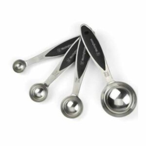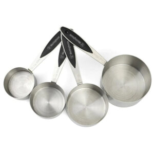 Las resistentes tazas medidoras de acero inoxidable están diseñadas para facilitar la nivelación de ingredientes y lograr una mayor precisión. Las tazas tienen marcas de medición grabadas permanentes, y también cuenta con un anillo conector para que podas almacenarlas cómodamente.