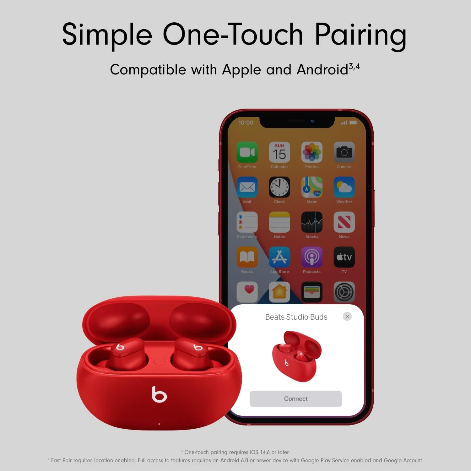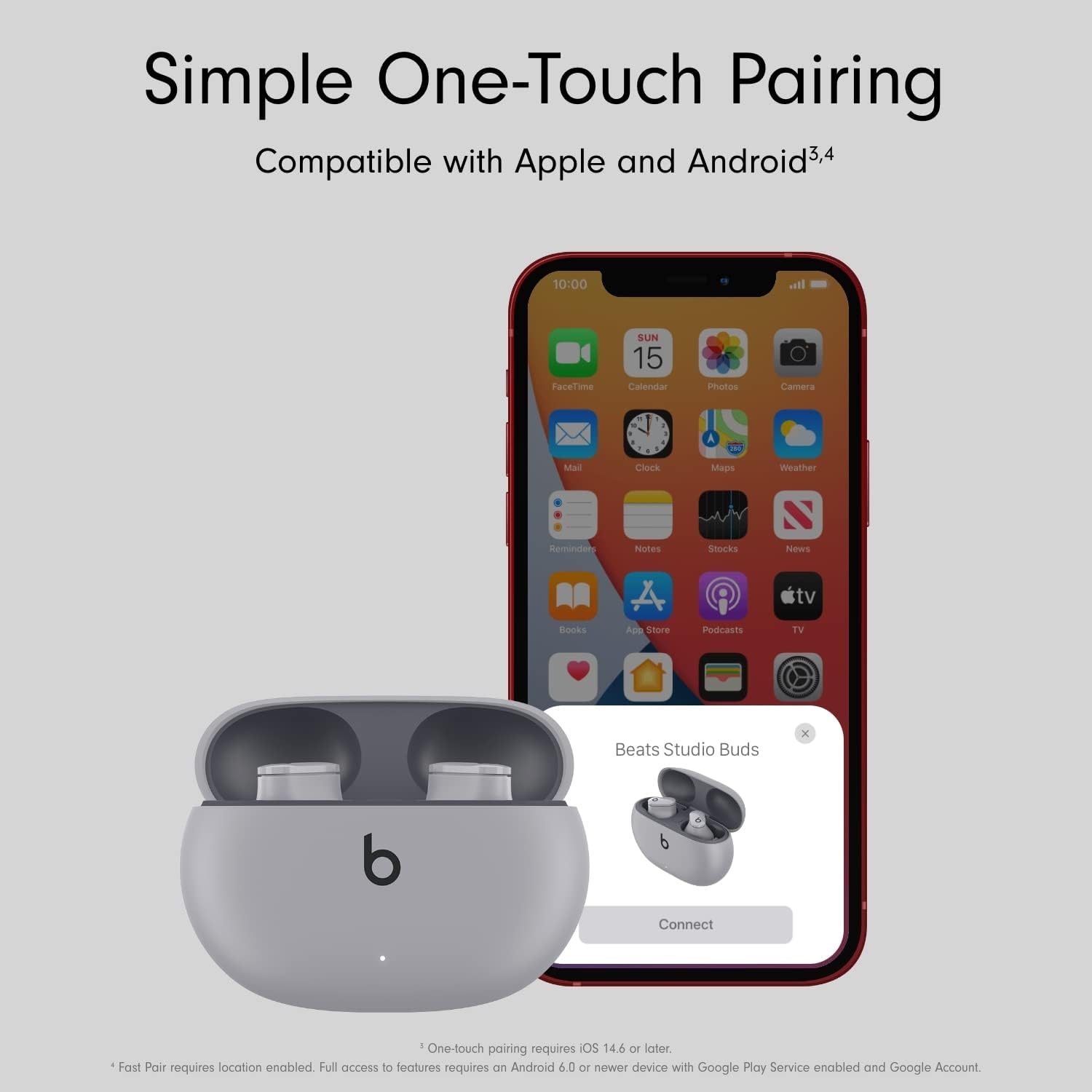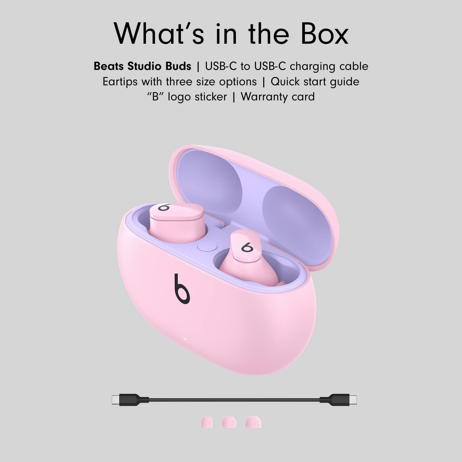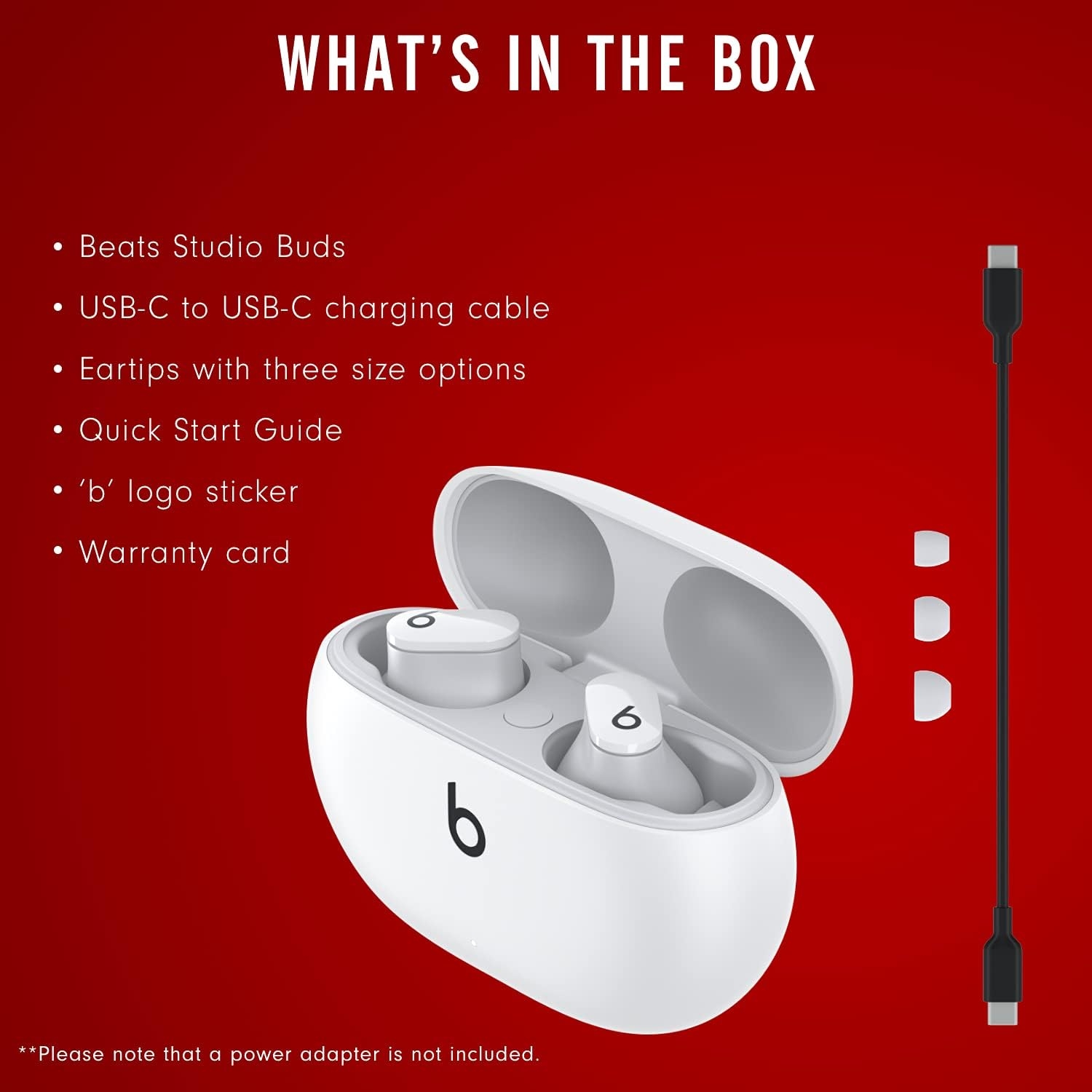 - Incluye: Audífonos Beats Studio Buds, estuche de carga, almohadillas de silicón (S/M/L), cable de carga USB-C, guía de inicio rápido.