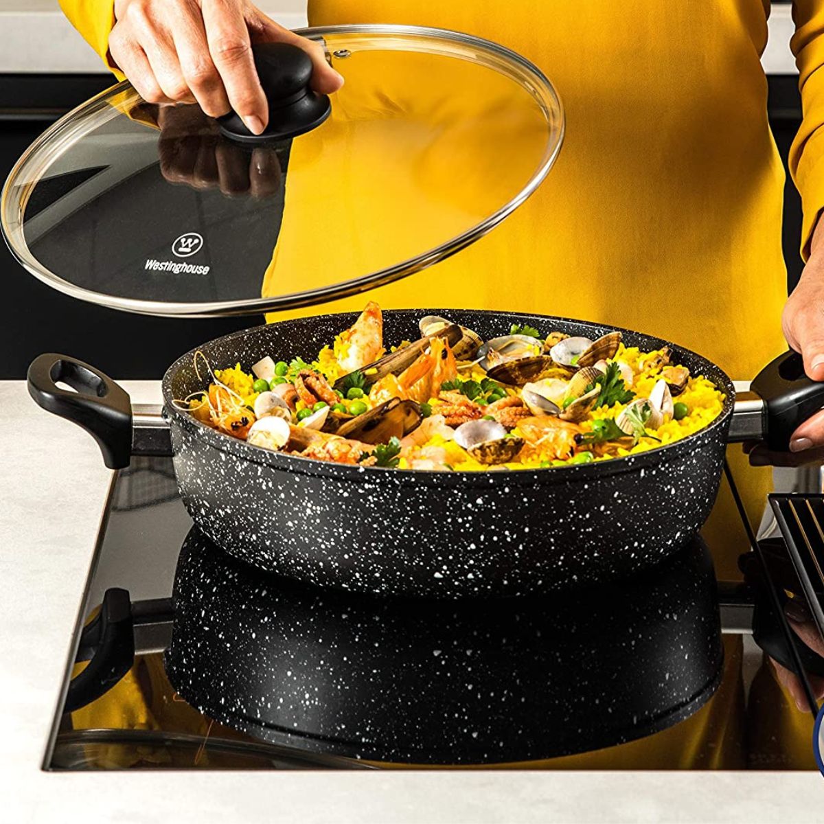 Es el momento de darle a tu cocina el toque que le falta. La cacerola de Mármol Granizado Negro de Westinghouse te ofrece la más alta calidad para que no te falte nada a la hora de cocinar tus platillos favoritos. Las tres capas de mármol antiadherente te dan los mejores resultados para tus recetas.
