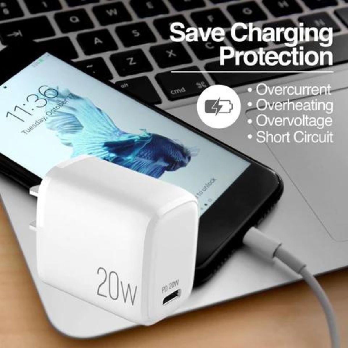 Cargador PD (Power Delivery) con capacidad de carga rápida de 20 W. Cargá 3 veces más rápido y disfrutá más tiempo con tus dispositivos móviles. Los cargadores PD son livianos y de diseño compacto; tendrás acceso a una carga rápida donde quiera que vayas utilizando cualquier tomacorriente de pared de CA estándar. Compatible con todos los dispositivos de carga rápida e incluye características de seguridad como sobrecorriente, sobretensión y cortocircuito.