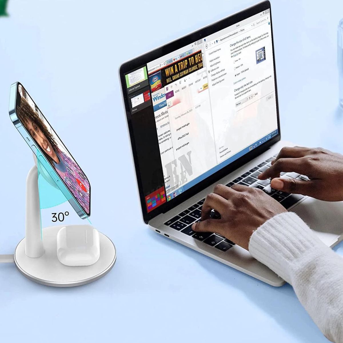Podés cargar dos dispositivos simultaneamente, el iPhone 12 en el soporte de cargador inalámbrico magnético y sus Airpods en la plataforma de carga inferior, ahora disfrutá de una experiencia de carga rápida y simultánea.