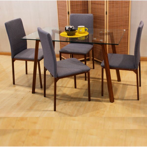 Las sillas, fabricadas con una sólida estructura de metal, están bellamente tapizadas con tela de lino, brindando así una apariencia sofisticada y una experiencia de asiento sumamente confortable. En cuanto a la mesa, esta cuenta con una estructura de metal resistente y una superficie de vidrio transparente, lo que añade un toque de luminosidad y elegancia al conjunto.