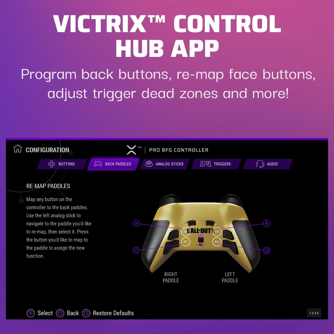 - Actualización de firmware: una nueva actualización de firmware de Windows 11 (solo PC) está disponible para tu controlador Pro BFG y Dongle para prolongar la vida útil de la batería y mejorar la estabilidad inalámbrica; descarga el Victrix Control Hub.