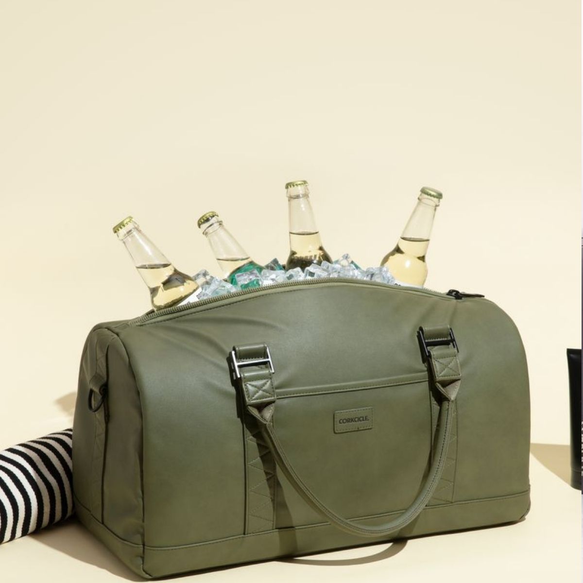 Tenés una correa para el hombro acolchada, flexible y extraíble, con herrajes personalizados, para que usés el bolso de forma más práctica. Podés llevar allí 24 latas o 12 latas y cuatro botellas de vino, un accesorio ideal para ir a la playa o el campo, sin perder el estilo.