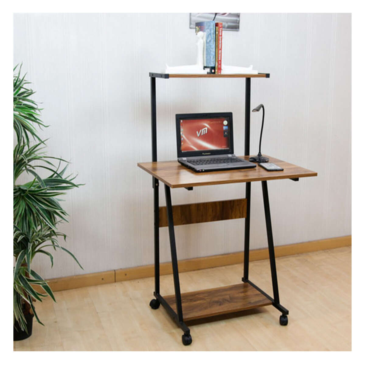 Este escritorio con rodines cuenta con la comodidad que deseas, ya que posee una movilidad espectacular gracias a sus rodines plásticos, un estante aereo y armazón metálica para mayor resistencia, además podes combinarlo con tu habitación por su color madera rústica. El material de la parte superior es de madera aglomerada laminada en melamina color madera rústica por lo que te dará una fortaleza extra y medidas perfectas para tu comodidad.