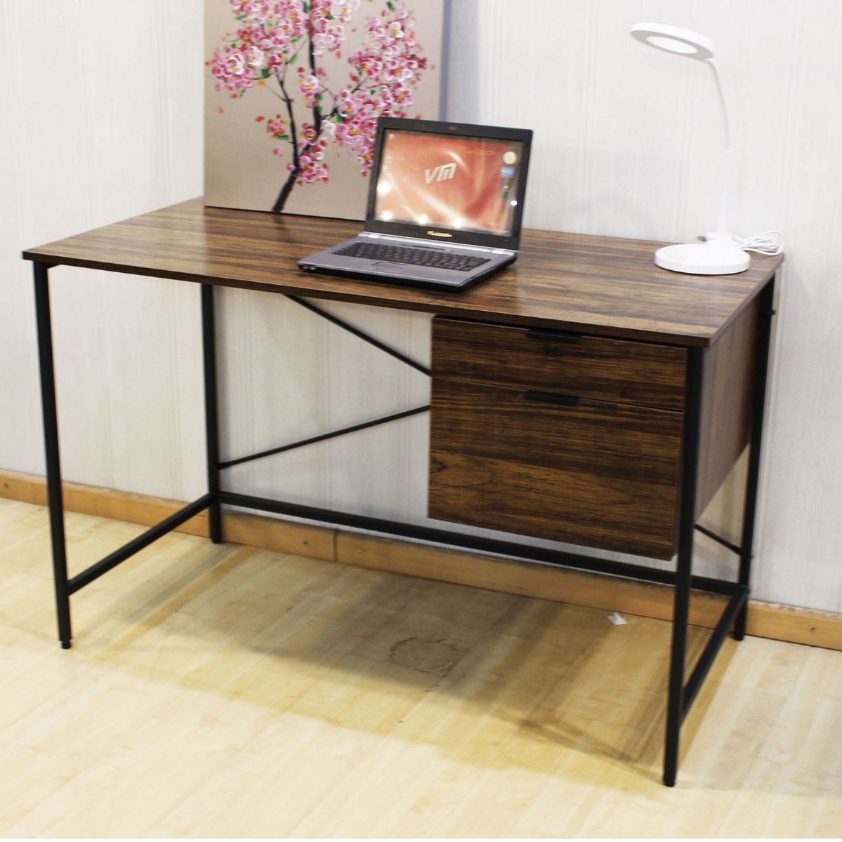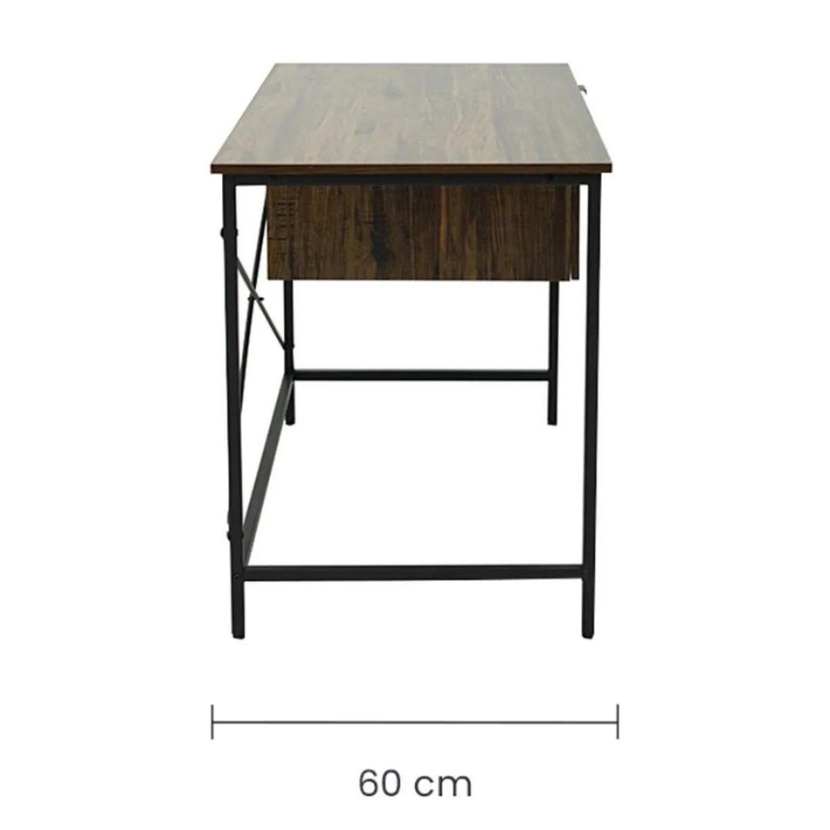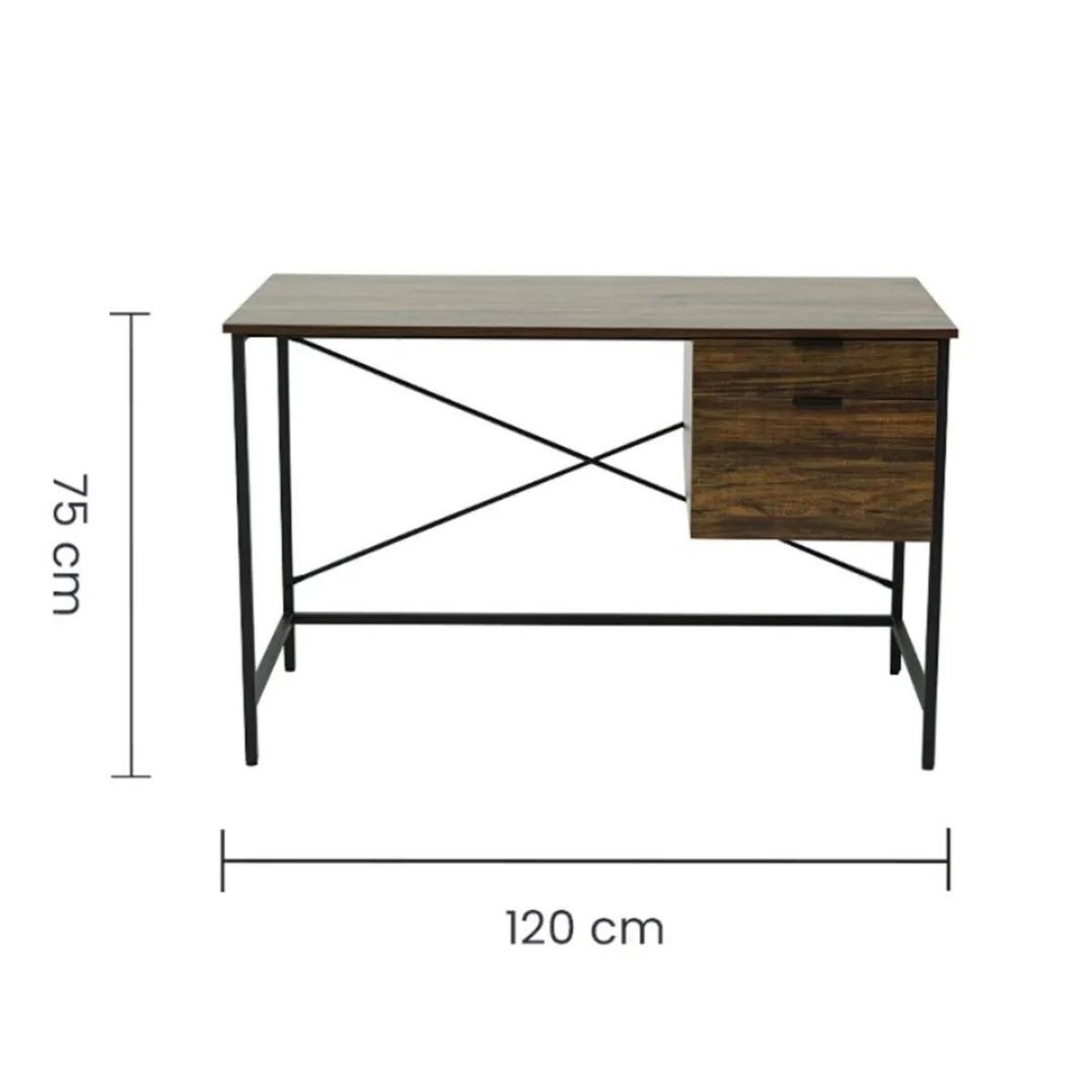 Elaborado con madera MDF con lámina de PVC que cubre, protege y aporta un acabado rústico. Su estructura está fabricada en metal. Es ideal para teletrabajo y espacios pequeños.