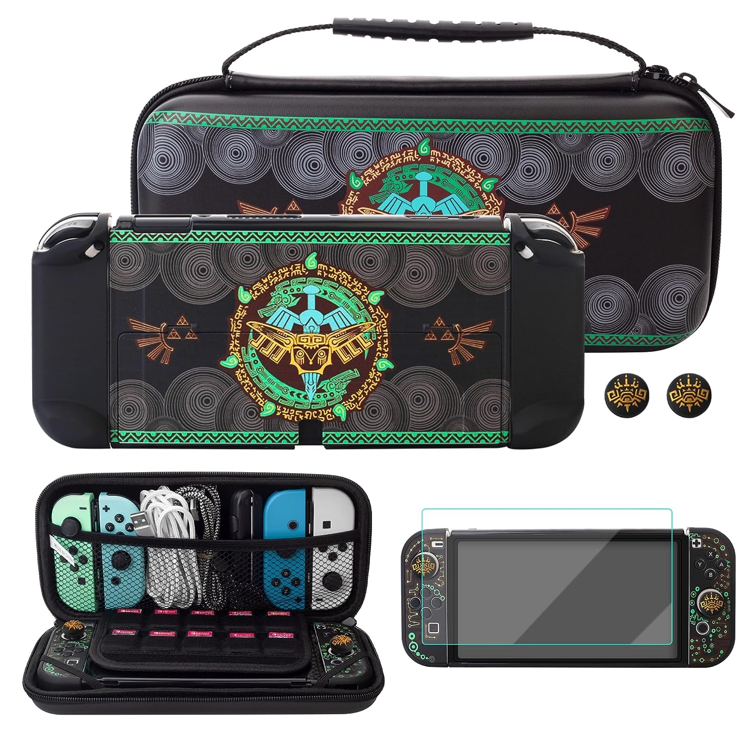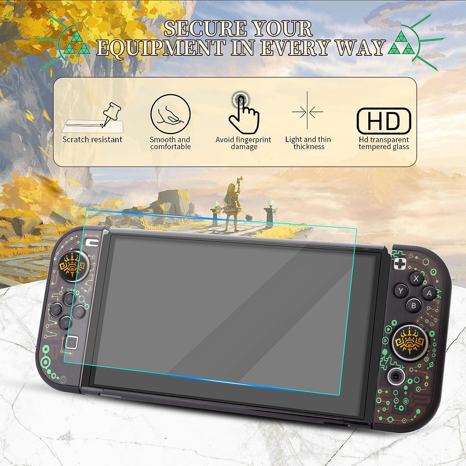 El protector de pantalla incluido es ultrafino y de alta definición, lo que lo hace resistente a los arañazos y reduce eficazmente la acumulación de huellas dactilares sin afectar la sensibilidad táctil. También encontrarás una tapa de silicona para el pulgar que presenta el atractivo patrón de juego de Tears of The Kingdom, proporcionando una protección adicional para la palanca de control.