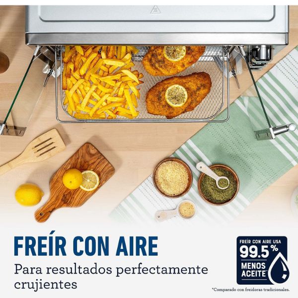 Su nueva función de freír con aire incorporada en este horno, te permite crear una variedad de comidas deliciosas y saludables, siempre con resultados perfectamente crujientes. Con la gran capacidad de 42L es posible cocinar dos platos al mismo tiempo para toda la familia. Escoge entre 5 funciones pre-programadas: tostar, hornear, asar, turbo convección.