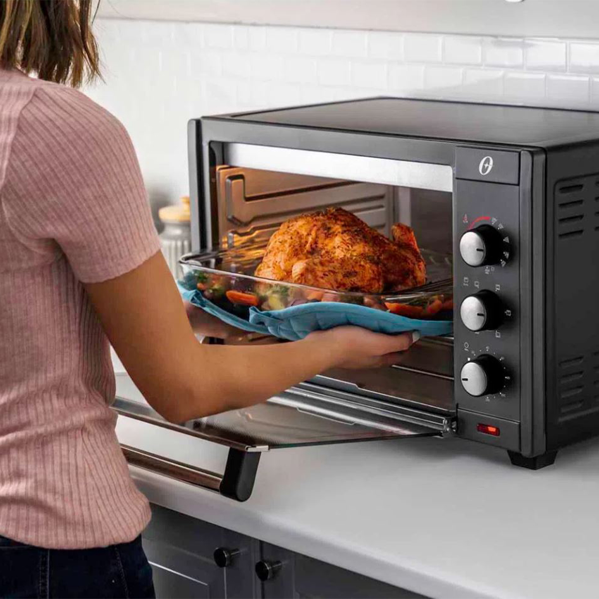 Con una capacidad de 45 litros, este horno es ideal para familias grandes o para aquellos que les gusta cocinar en grandes cantidades. También cuenta con una pantalla digital para controlar la temperatura y el tiempo de cocción, y un temporizador para que puedas programar el horno para que se apague automáticamente cuando la comida esté lista.