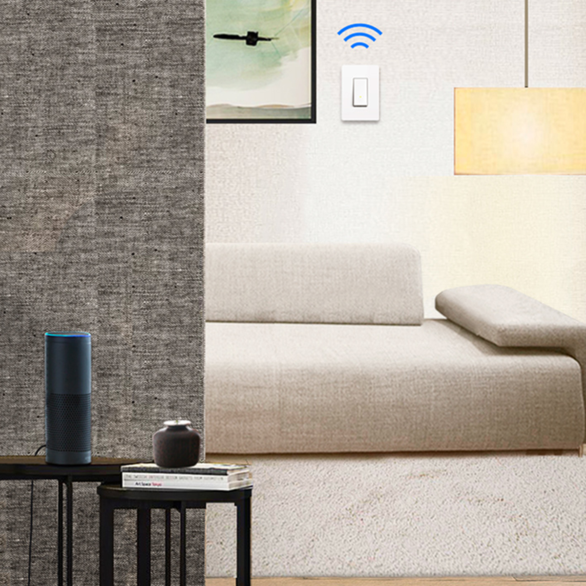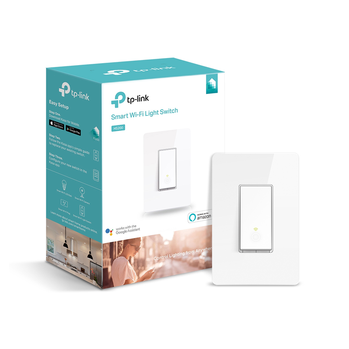 Se trata de un interruptor hecho con plástico resistente de un solo polo, para instalar en paredes o muros, que se acciona solo con presionar un botón. También puede sincronizarse con cualquier dispositivo móvil gracias a la aplicación Kasa.