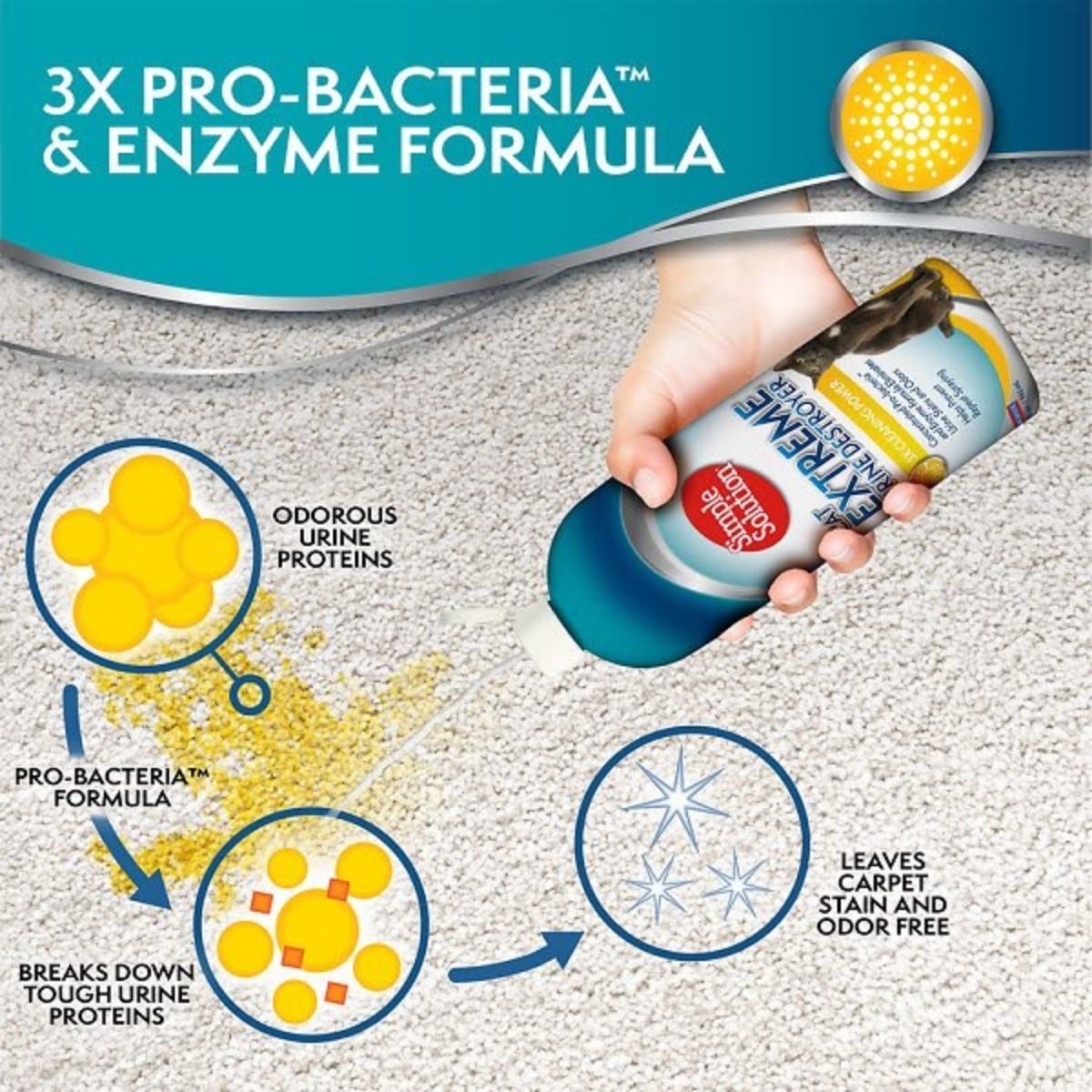- La fórmula pro-bacterias y enzimas elimina las manchas y los olores de orina.