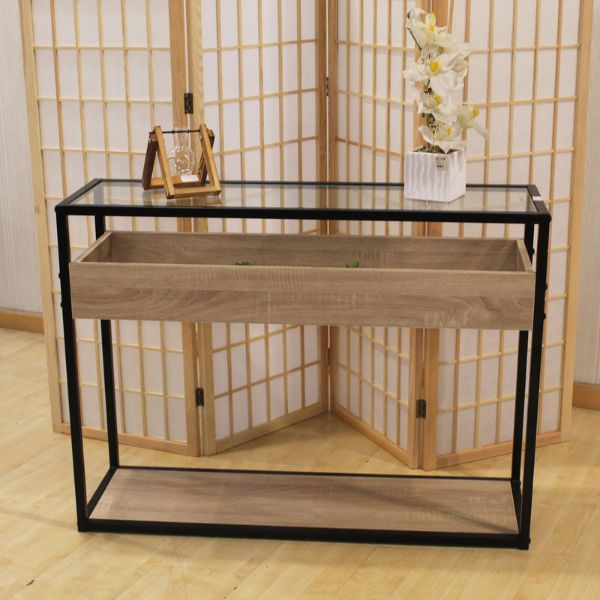 Por otro lado esta mesa de entrada está diseñada pensando en la durabilidad y la estética. Su estructura combina metal y madera aglomerada laminada para crear un aspecto moderno y atractivo. La parte superior de vidrio agrega un toque de sofisticación y permite exhibir decoraciones o fotos familiares con estilo.