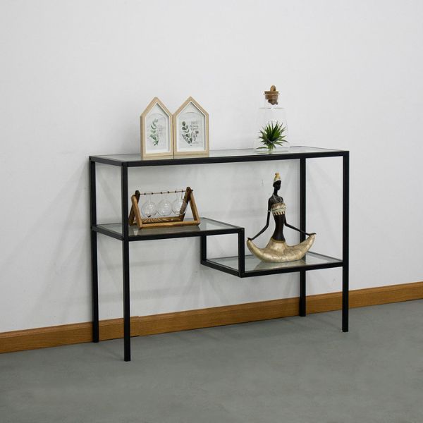 La combinación de vidrio de alta calidad con metal de alta resistencia garantiza que esta consola sea una elección excelente en términos de durabilidad y tendencia moderna. Sus tres estantes proporcionan espacio suficiente para exhibir artículos decorativos, macetas, libros, llaves u otros objetos que desees tener a tu alcance. Además, su color neutro permite que se integre de manera armoniosa con la mayoría de estilos de decoración que puedas tener en tus espacios, convirtiéndola en una elección acertada para embellecer cualquier rincón de tu hogar.