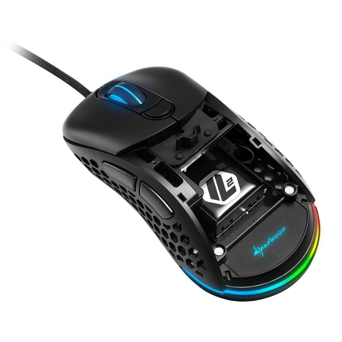 Debido a la estructura de nido de abeja de los lados, la parte inferior y la superficie superior, el peso del ratón para juego se ha reducido a lo más esencial. Con sólo 62 gramos, es tan ligero como el aire bajo la punta de tus dedos y permite movimientos fluidos sin resistencia o fatiga perceptibles.