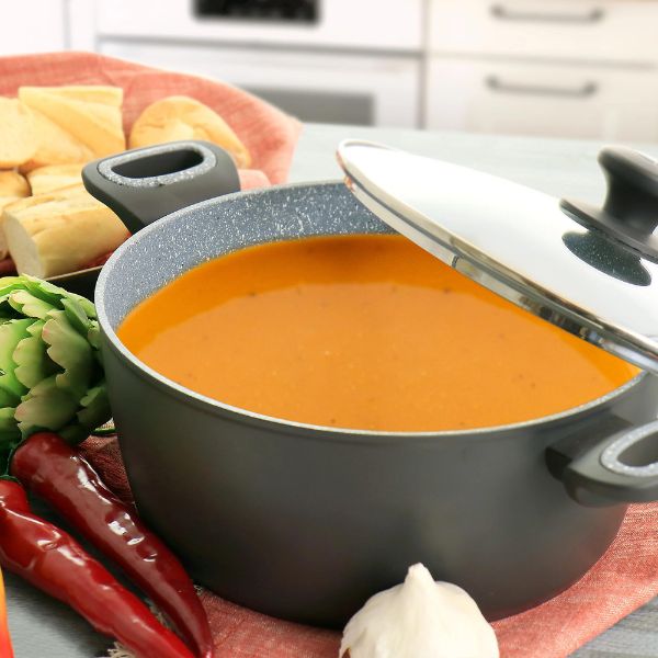 Con un grosor de 2.9 mm, la olla garantiza una distribución uniforme del calor para lograr resultados de cocción óptimos. Los mangos de baquelita ofrecen un agarre cómodo, permitiéndote manejar la olla con facilidad y seguridad. Además, la olla está equipada con un recubrimiento antiadherente, asegurando una fácil liberación de los alimentos y facilitando la limpieza. Esta característica es especialmente útil para aquellos que buscan una cocina sin complicaciones.