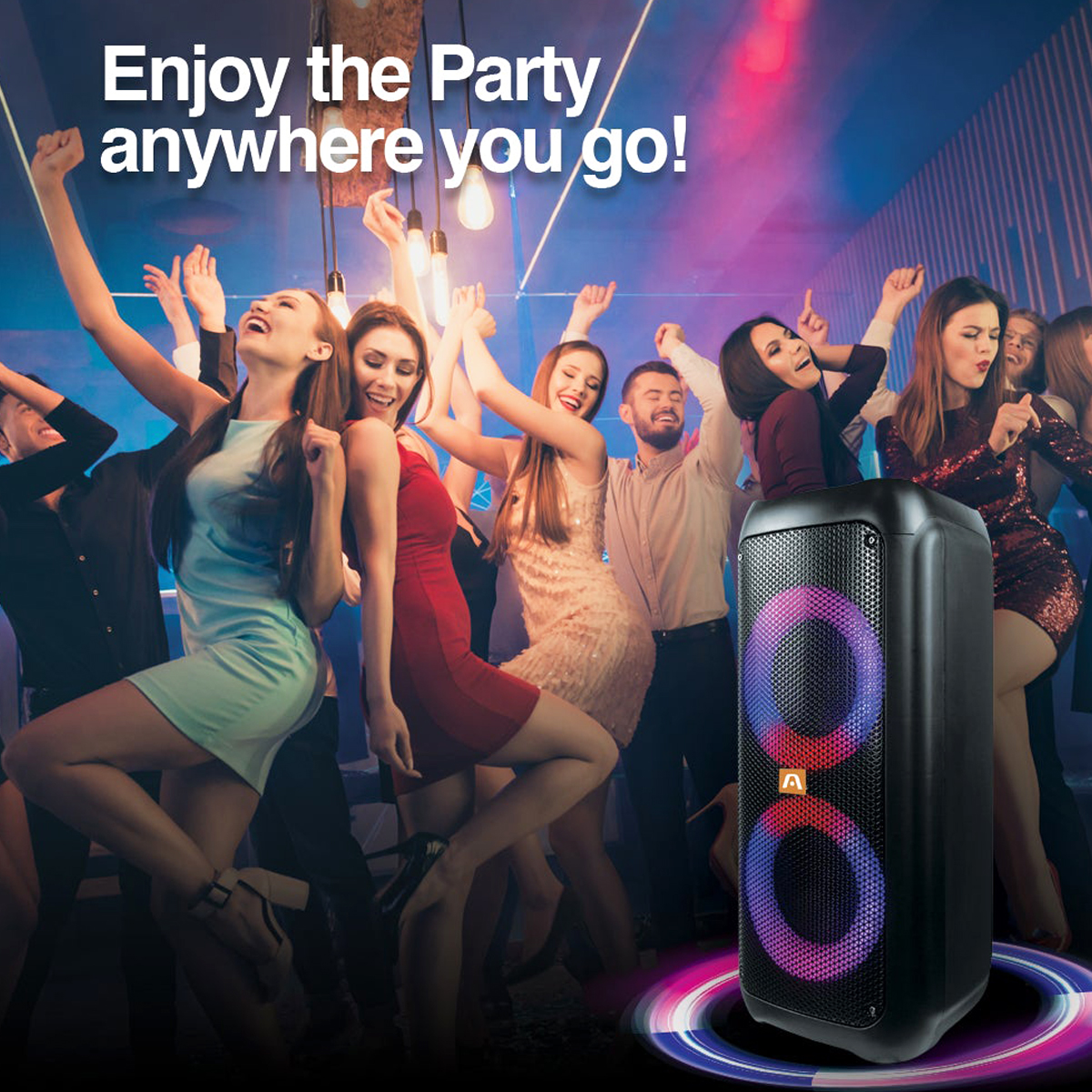 El Rave 60 está equipado con 700 vatios de potencia de sonido y una tecnología de graves de alta gama. Viene con dos bocinas de 6.5 pulgadas, efectos de iluminación, una batería de 3600 mAh e incluye micrófono con cable.
