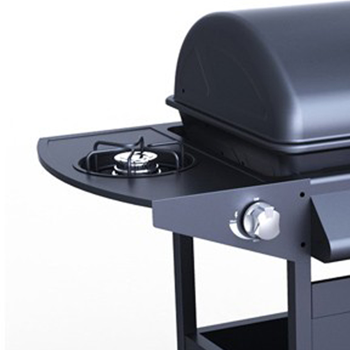 Esta parrilla es a gas y posee tapa con bisagras para fácil acceso, los quemadores de acero inoxidable emiten llamas para una cocción uniforme y con mayor durabilidad; tiene una mesa auxiliar en la que podés picar carne o preparar otros alimentos, cuenta con termómetro para monitorear la temperatura de cocción y parrilla de calentamiento.