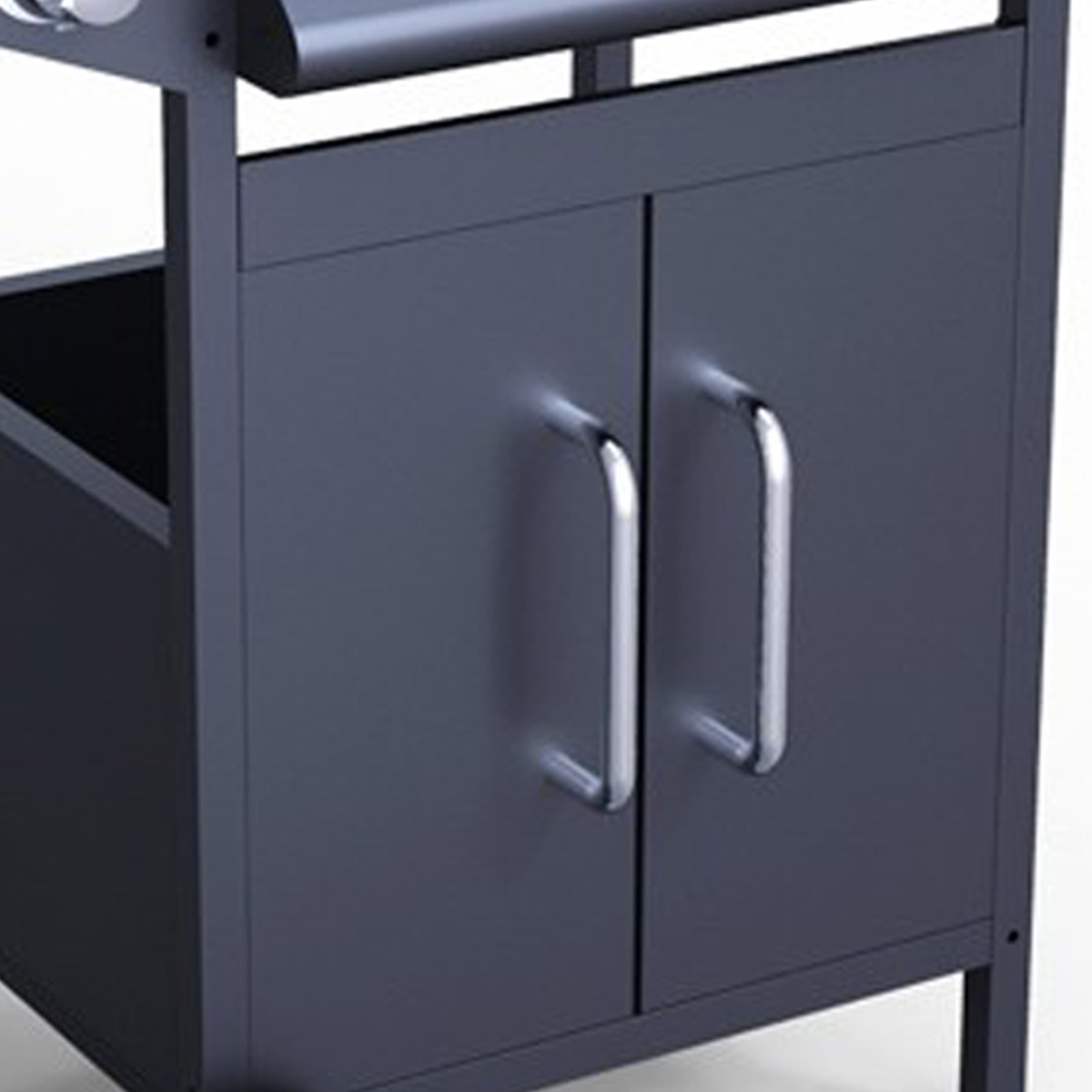 Viene con estante inferior con puertas y controles manuales, se puede mover fácilmente gracias a sus ruedas, ideal para exteriores, con un diseño hermoso que combina en diferentes espacios.