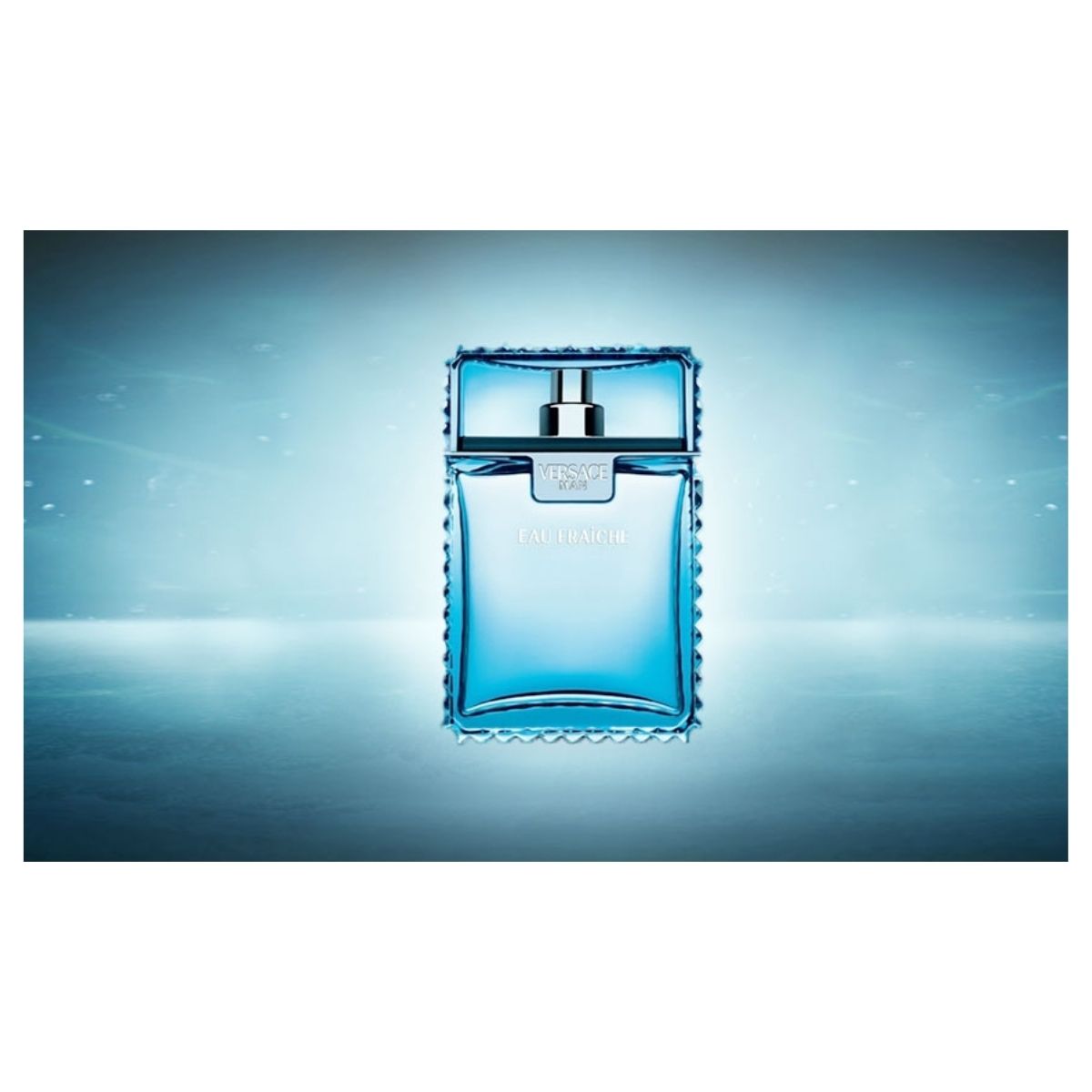El frasco, mantiene el diseño rectangular con los bordes tallados en zigzag de la anterior Versace Man, pero con un tono uniforme azul claro, que le proporciona un aspecto luminoso y fresco.