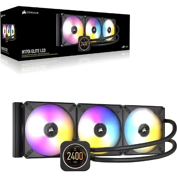 El refrigerador líquido Corsair iCUE H170i ELITE LCD, ofrece una refrigeración potente y personalizada para los diseños de PC más codicioso, cuenta con una pantalla LCD de 2.1″ donde puedes ver imágenes e información del sistema y tres ventiladores PWM CORSAIR ML140 RGB ELITE de última generación.