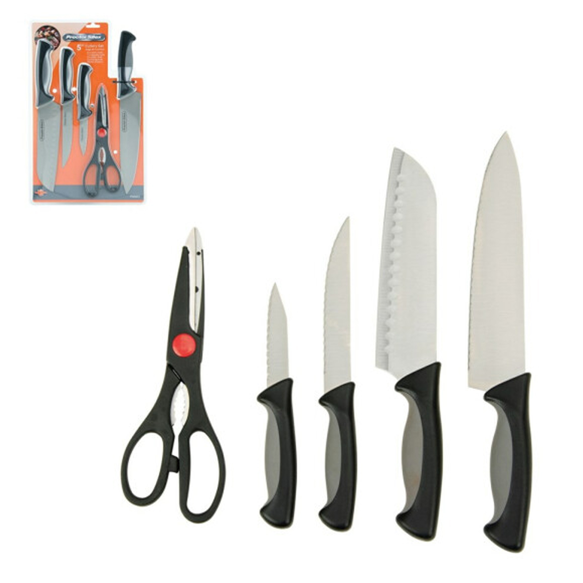 Con este juego de cuchillos, contás con mangos suaves y ergonómicos de dos tonos. Disponés de cuatro cuchillos tipo profesional y una tijera para que usés en la cocina.