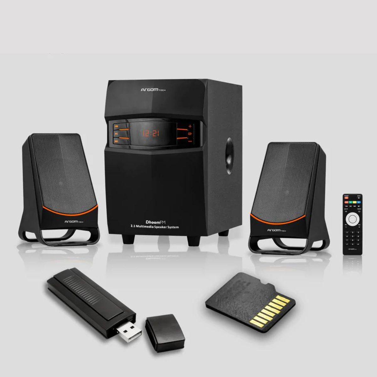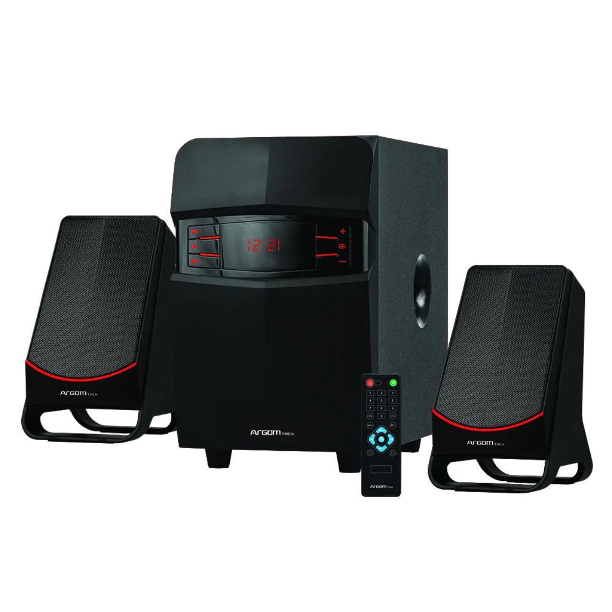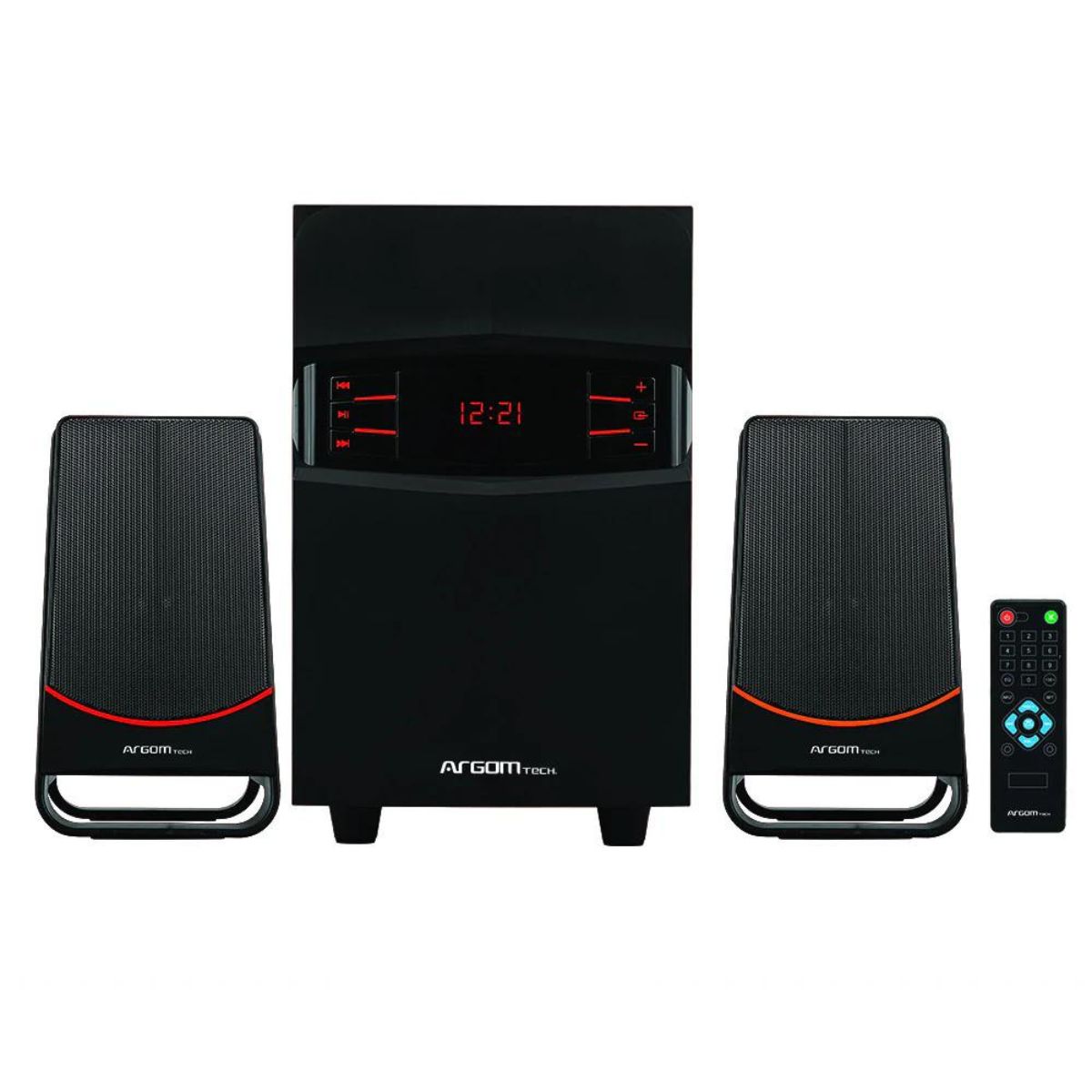 El sistema de audio 2.1 consigue un excelente rendimiento acústico. Cuenta con un alcance efectivo de 10 metros y viene con un control remoto, que integra los botones de ajuste de volumen y encendido/apagado.