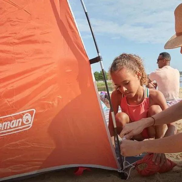 La Sombra Coleman Skyshade la podés poner fácilmente con postes preinstalados. El piso extendido le permite estirarse y relajarse y el techo extendido le brinda sombra adicional contra el sol del mediodía. Una ventilación trasera ayuda a agregar flujo de aire adicional, mientras que 7 estacas y 3 sacos de arena mantienen la sombra en su lugar.
